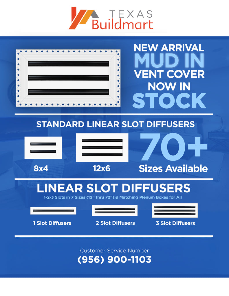 - Texas Buildmart offers Mud In Air Vent Covers also known as Drywall Mud-in White Air Vents. This Mud In Air Vent Cover shoots a 90-degree spread with option to adjust to one side or the other. These have decorative directional dampers. Modern, crisp, clean lines and architecturally appealing. Solid extruded aluminum profile, expertly welded, grinded, and sanded, with reinforcement brackets on the back and a uniform coat of electrostatic paint for a sleek, modern finish and easy maintenance. This white air vent register can be used as a supply air vent cover for ceilings and walls and as a return air vent cover register but looks like a Luxury Drywall Mud-in Vent Cover. If our Mud In Air Vent Cover is used as a Return air vent cover, please make sure the air vent cover is placed in the full open position or remove the directional dampers. Update your Ceiling and Wall Vents with our Mud In Air Vent Covers and it will update the entire look of your Home or Office Space. Rejillas para aire acondicionado de casa blanco. We make all sizes from 6x4 to 30x24 Modern Mud Air Vent Covers for the Modern Day Home. *This is a Design and Utility Patent Pending Product*