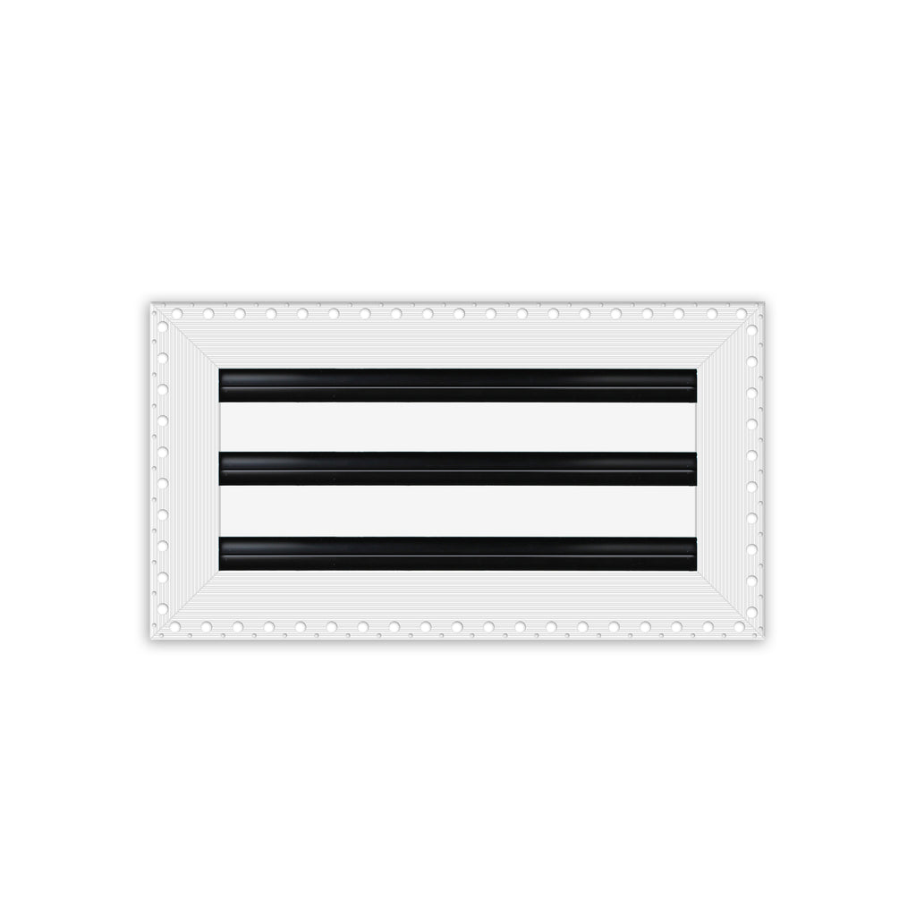 - Texas Buildmart offers Mud In Air Vent Covers also known as Drywall Mud-in White Air Vents. This Mud In Air Vent Cover shoots a 90-degree spread with option to adjust to one side or the other. These have decorative directional dampers. Modern, crisp, clean lines and architecturally appealing. Solid extruded aluminum profile, expertly welded, grinded, and sanded, with reinforcement brackets on the back and a uniform coat of electrostatic paint for a sleek, modern finish and easy maintenance. This white air vent register can be used as a supply air vent cover for ceilings and walls and as a return air vent cover register but looks like a Luxury Drywall Mud-in Vent Cover. If our Mud In Air Vent Cover is used as a Return air vent cover, please make sure the air vent cover is placed in the full open position or remove the directional dampers. Update your Ceiling and Wall Vents with our Mud In Air Vent Covers and it will update the entire look of your Home or Office Space. Rejillas para aire acondicionado de casa blanco. We make all sizes from 6x4 to 30x24 Modern Mud Air Vent Covers for the Modern Day Home. *This is a Design and Utility Patent Pending Product*