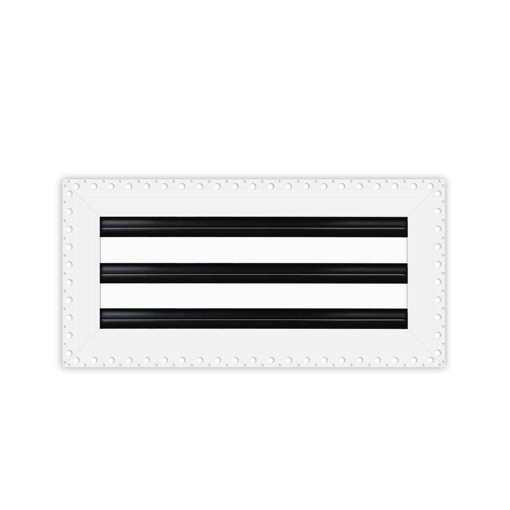 - Texas Buildmart offers Mud In Air Vent Covers also known as Drywall Mud-in White Air Vents. This Mud In Air Vent Cover shoots a 90-degree spread with option to adjust to one side or the other. These have decorative directional dampers. Modern, crisp, clean lines and architecturally appealing. Solid extruded aluminum profile, expertly welded, grinded, and sanded, with reinforcement brackets on the back and a uniform coat of electrostatic paint for a sleek, modern finish and easy maintenance. This white air vent register can be used as a supply air vent cover for ceilings and walls and as a return air vent cover register but looks like a Luxury Drywall Mud-in Vent Cover. If our Mud In Air Vent Cover is used as a Return air vent cover, please make sure the air vent cover is placed in the full open position or remove the directional dampers. Update your Ceiling and Wall Vents with our Mud In Air Vent Covers and it will update the entire look of your Home or Office Space. Rejillas para aire acondicionado de casa blanco. We make all sizes from 6x4 to 30x24 Modern Mud Air Vent Covers for the Modern Day Home. *This is a Design and Utility Patent Pending Product*