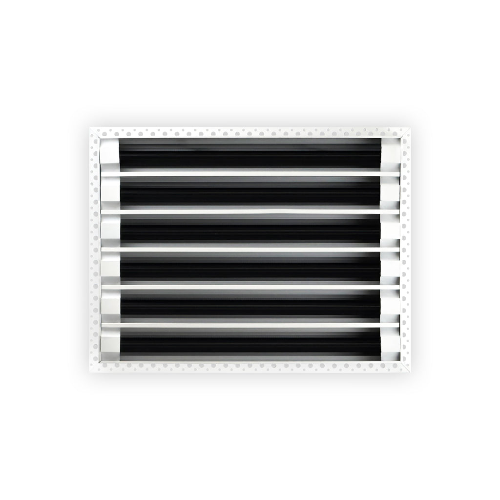- Texas Buildmart offers Mud In Air Vent Covers also known as Drywall Mud-in White Air Vents. This Mud In Air Vent Cover shoots a 90-degree spread with option to adjust to one side or the other. These have decorative directional dampers. Modern, crisp, clean lines and architecturally appealing. Solid extruded aluminum profile, expertly welded, grinded, and sanded, with reinforcement brackets on the back and a uniform coat of electrostatic paint for a sleek, modern finish and easy maintenance. This white air vent register can be used as a supply air vent cover for ceilings and walls and as a return air vent cover register but looks like a Luxury Drywall Mud-in Vent Cover. If our Mud In Air Vent Cover is used as a Return air vent cover, please make sure the air vent cover is placed in the full open position or remove the directional dampers. Update your Ceiling and Wall Vents with our Mud In Air Vent Covers and it will update the entire look of your Home or Office Space. Rejillas para aire acondicionado de casa blanco. We make all sizes from 6x4 to 30x24 Modern Mud Air Vent Covers for the Modern Day Home. *This is a Design and Utility Patent Pending Product*