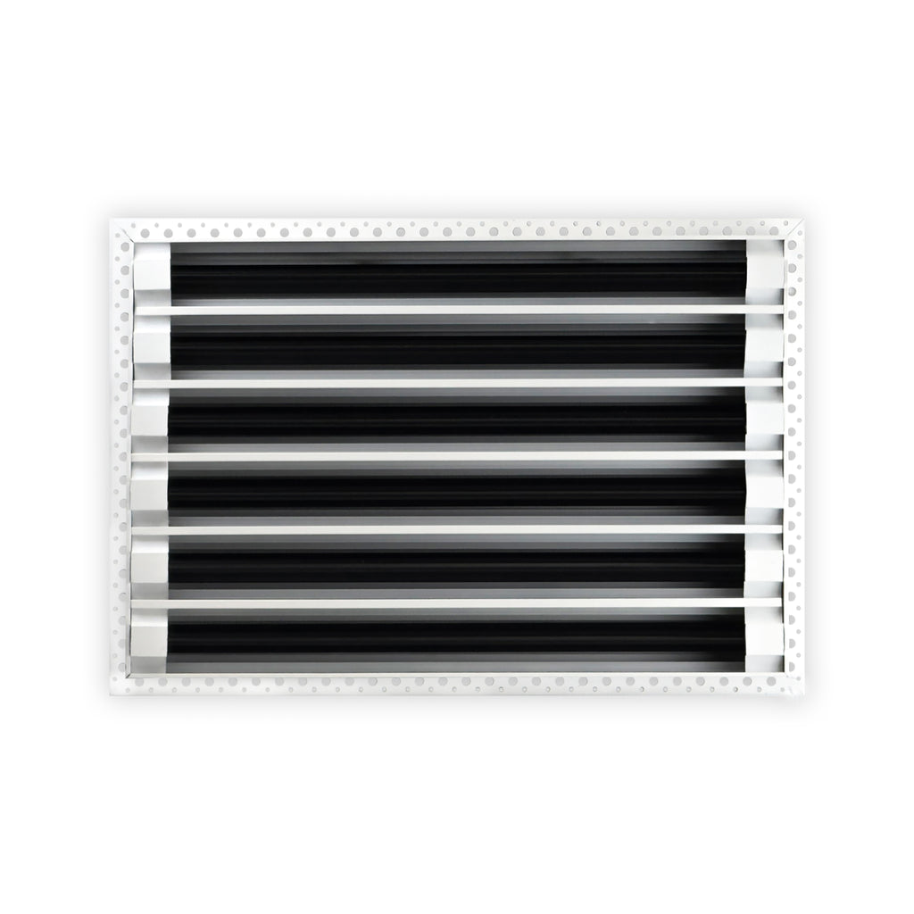 - Texas Buildmart offers Mud In Air Vent Covers also known as Drywall Mud-in White Air Vents. This Mud In Air Vent Cover shoots a 90-degree spread with option to adjust to one side or the other. These have decorative directional dampers. Modern, crisp, clean lines and architecturally appealing. Solid extruded aluminum profile, expertly welded, grinded, and sanded, with reinforcement brackets on the back and a uniform coat of electrostatic paint for a sleek, modern finish and easy maintenance. This white air vent register can be used as a supply air vent cover for ceilings and walls and as a return air vent cover register but looks like a Luxury Drywall Mud-in Vent Cover. If our Mud In Air Vent Cover is used as a Return air vent cover, please make sure the air vent cover is placed in the full open position or remove the directional dampers. Update your Ceiling and Wall Vents with our Mud In Air Vent Covers and it will update the entire look of your Home or Office Space. Rejillas para aire acondicionado de casa blanco. We make all sizes from 6x4 to 30x24 Modern Mud Air Vent Covers for the Modern Day Home. *This is a Design and Utility Patent Pending Product*