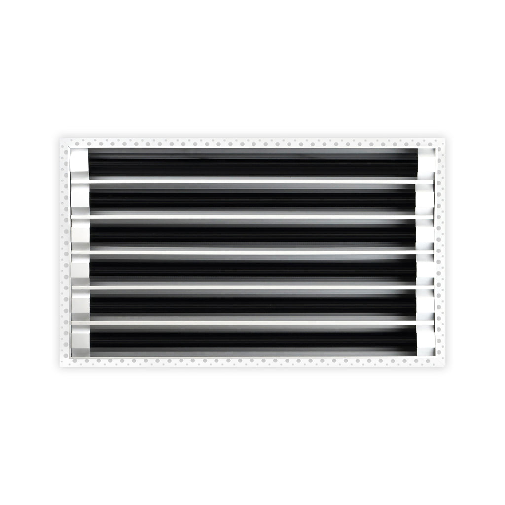 - Texas Buildmart offers Mud In Air Vent Covers also known as Drywall Mud-in White Air Vents. This Mud In Air Vent Cover shoots a 90-degree spread with option to adjust to one side or the other. These have decorative directional dampers. Modern, crisp, clean lines and architecturally appealing. Solid extruded aluminum profile, expertly welded, grinded, and sanded, with reinforcement brackets on the back and a uniform coat of electrostatic paint for a sleek, modern finish and easy maintenance. This white air vent register can be used as a supply air vent cover for ceilings and walls and as a return air vent cover register but looks like a Luxury Drywall Mud-in Vent Cover. If our Mud In Air Vent Cover is used as a Return air vent cover, please make sure the air vent cover is placed in the full open position or remove the directional dampers. Update your Ceiling and Wall Vents with our Mud In Air Vent Covers and it will update the entire look of your Home or Office Space. Rejillas para aire acondicionado de casa blanco. We make all sizes from 6x4 to 30x24 Modern Mud Air Vent Covers for the Modern Day Home. *This is a Design and Utility Patent Pending Product*